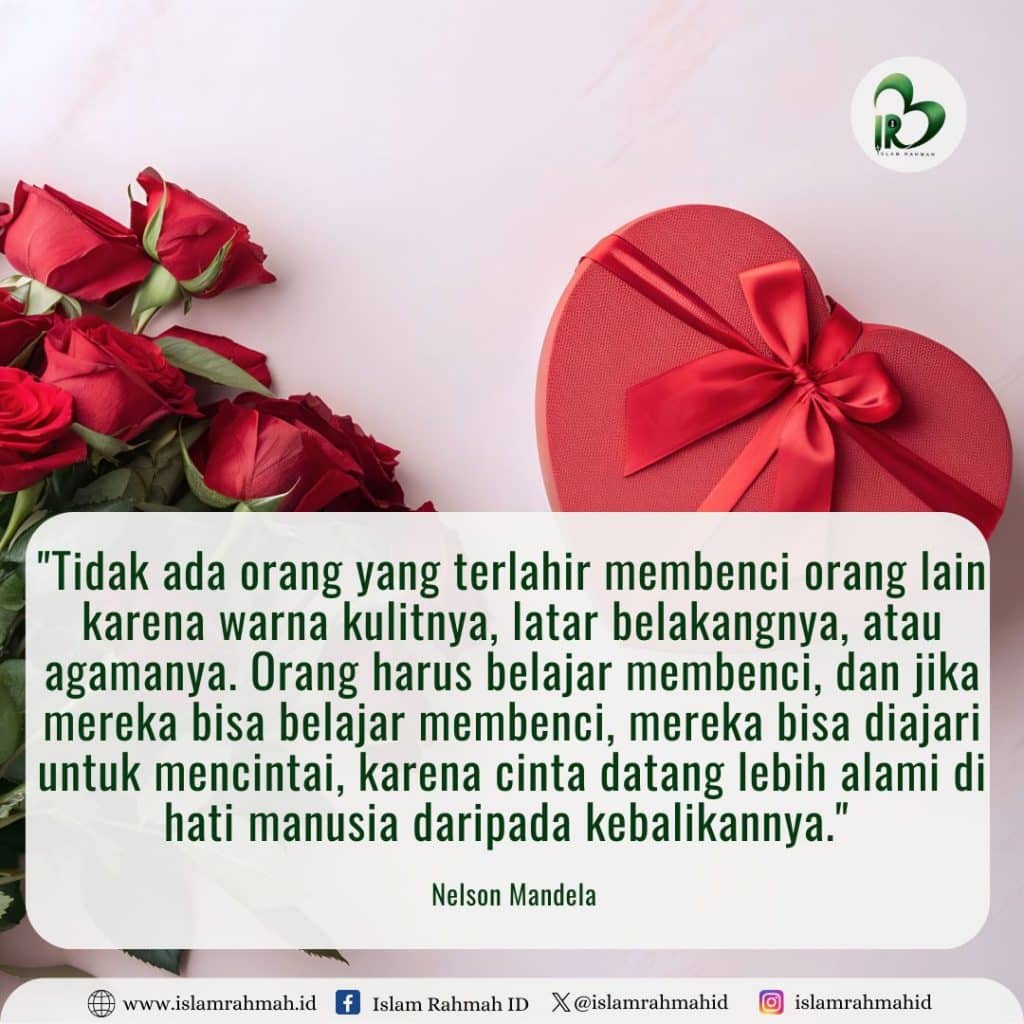 Tidak ada manusia yang dilahirkan dengan kebencian di dadanya. Seperti kata Nelson Mandela, “Tidak ada orang yang terlahir membenci orang lain karena warna kulitnya, latar belakangnya, atau agamanya. Orang harus belajar membenci, dan jika mereka bisa belajar membenci, mereka bisa diajari untuk mencintai, karena cinta datang lebih alami di hati manusia daripada kebalikannya.” [1] Kata-kata itu menggema begitu dalam, seolah mengingatkan kita bahwa cinta adalah fitrah, sedangkan kebencian adalah hasil dari ketidaktahuan dan jarak antar hati yang dibiarkan terlalu lama terbuka.
